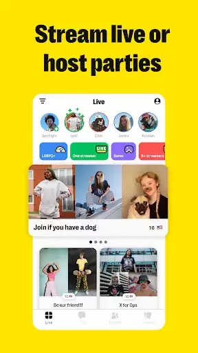 1) STREAM: Streaming is what we do! Here you can start a live video chat with up to 10 friends and even invite new potential friends to join you. Interact, sing, dance, talk about your day, send messages to the friends you love.
