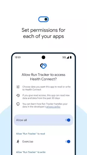 Update privacy settings in a few taps. Before a new app can access your data, you can review and choose what you want to share. If you change your mind, or want to see which apps recently accessed your data, find it all in Health Connect.