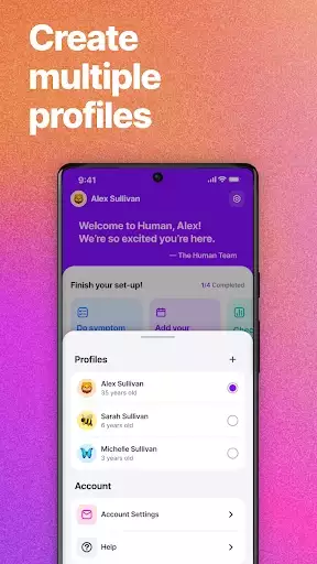 You can create multiple profiles in Human, making it easy for you to track your own health, as well as the health of those you care for, all in one place.