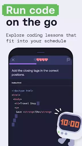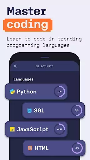With Mimo's Learn Coding and Programming app: Python, JavaScript, SQL, HTML coding app, you'll be able to: