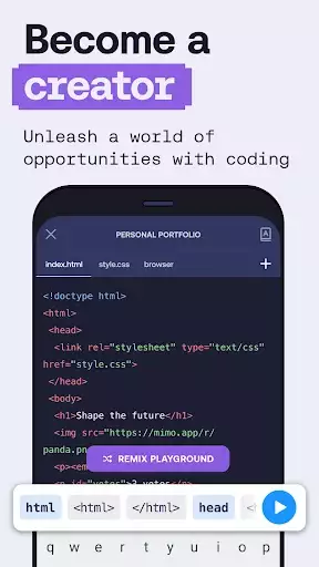 • Write real code on our mobile code editor - IDE, which helps you run code anywhere, compete with Mimo's community, solve coding challenges, and learn programming languages (Python, JavaScript, HTML, CSS, and SQL)!