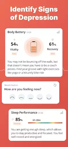 Also, you can recognize depression or burnout with a thought diary and mood tracker right in the app.