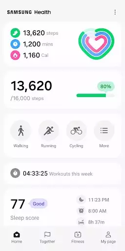 Work hard and always maintain your best condition with Samsung Health. Set goals that work for your own level, and keep track of your daily condition including your activity amount, workout intensity, heart rate, stress, oxygen level in the blood, etc.