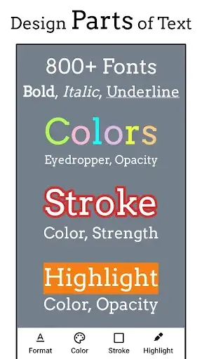 • Design parts of the text separately: supported in Font, Format, Color, Stroke, Highlight tools